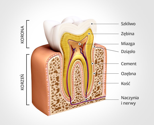 Widząc przekrój zęba możemy zauważyć również nerwy, które wpadają przez kanały do komory miazgi zęba. To ich zakończenia odpowiedzialne są za ostrzeganie nas o zmianach chorobowych zachodzących we wnętrzu zęba.